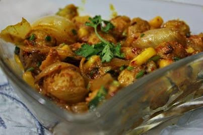 heat oil in the pan add onion into it and cook till it becomes light pink and keep it aside now in another pan heat oil and add finely chopped onion to it & cook it keep this aside take another pan add oil ,zeera,ginger,garlic and saute it add turmeric,ed chili powder,tomato puree,garam masala,sugar cook for 4-5 min add sweet corn,nutrela, onion& milk add salt cook it till it becomes thick garnish it with coriander leave serve hot.